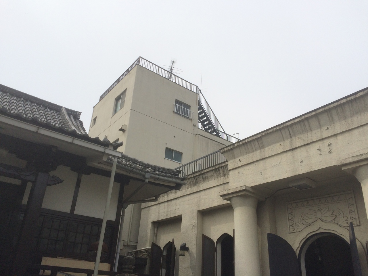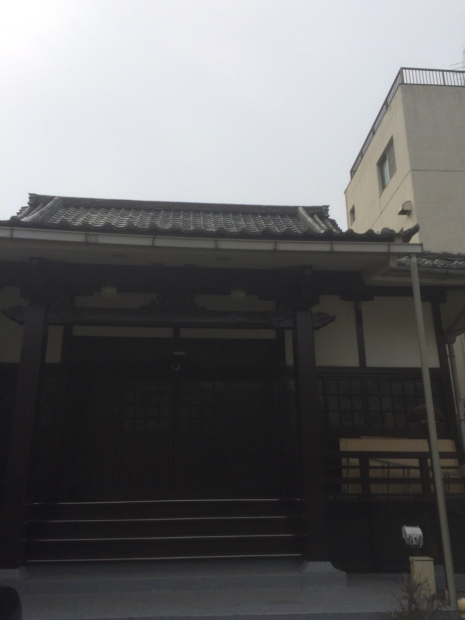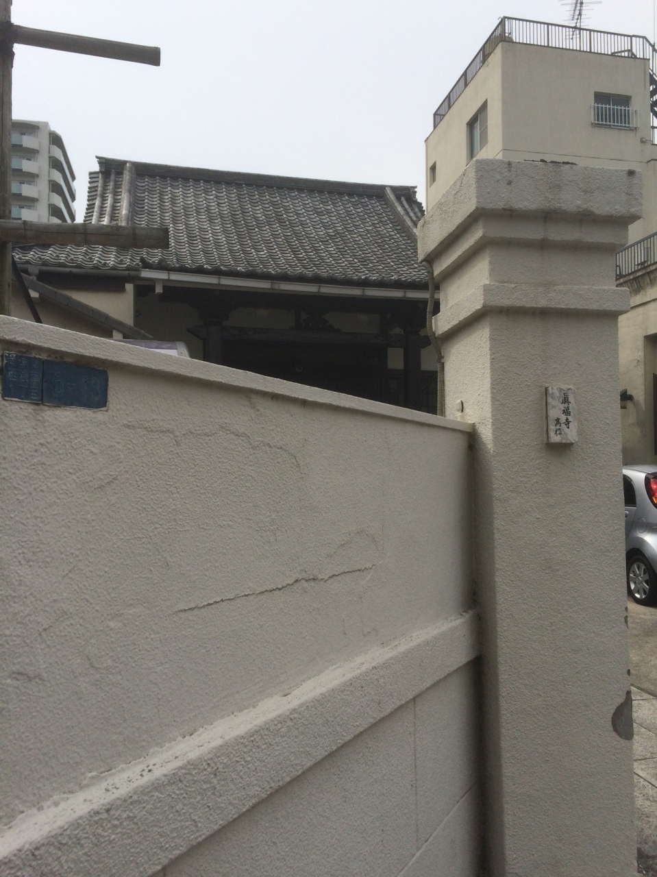 白い塀に囲まれて、境内に入ると車1台が停まっていて、その後ろが本殿でした。屋根は瓦屋根で特に特徴がない建物でした。横に白い建物があり、中がお墓になっていて、建物の中にお墓がある珍しい寺でした。狭い境内です。