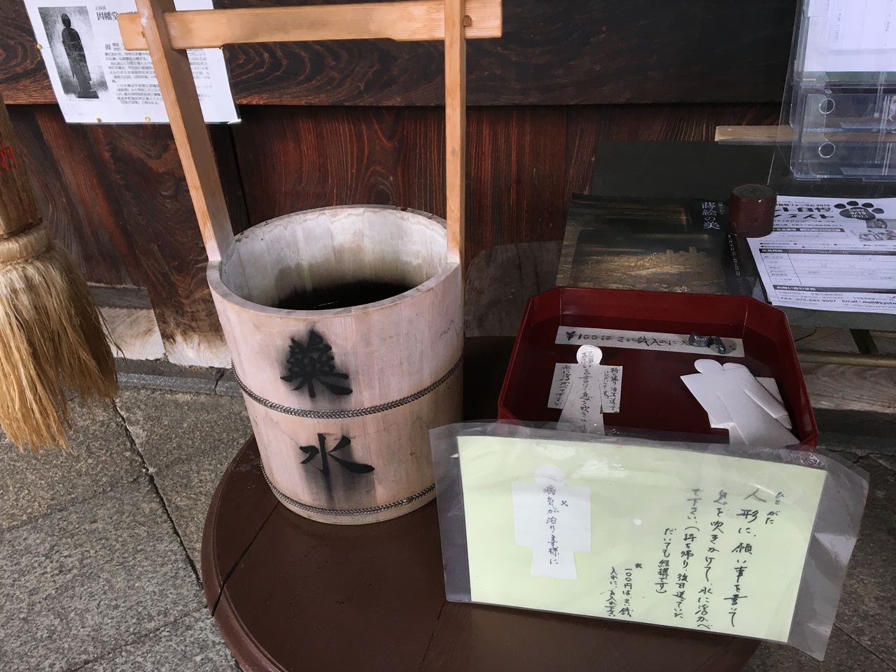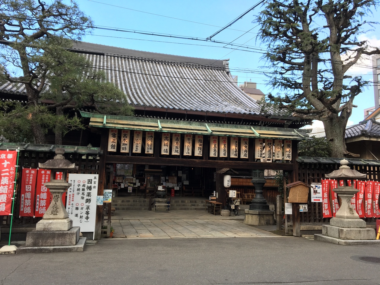 日本三如来のあるお寺です。因幡の国司が、帰京の途中にお告げで、海の中から引き上げた薬師如来像が京都に飛来したとの言い伝えで、因幡薬師と言われているらしいです。本殿の前に、薬水と書かれた水の入った桶と、横に人形に切られた紙が置いてあり、息を吹きかけて願いを書くようにされていました。都心ですが、静かな雰囲気の新しいでした。