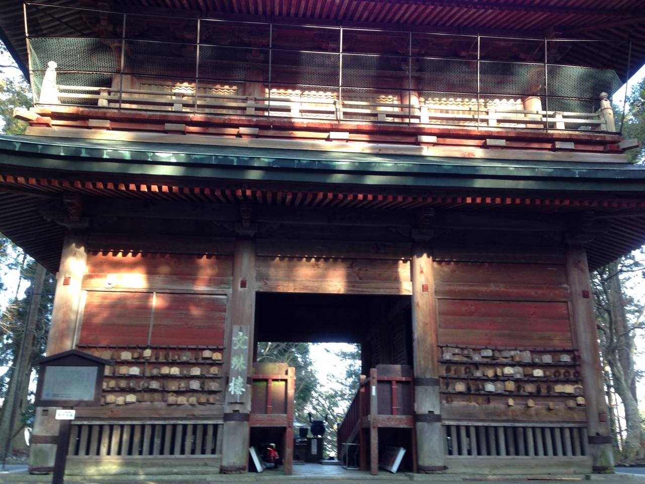 朱色に塗られた素敵な山門です。靴を脱いで直角に近い階段を上がると文殊菩薩が祀られていて、受験生が書いた合格祈願の絵馬がたくさん奉納されていました。上がるよりも、帰りの直角に近い階段を下りる方が恐かったです。