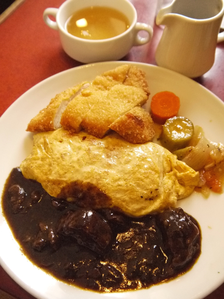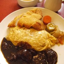 オムライス、チキンカツ、ハヤシソース、そして温野菜という、様々な洋食をワンプレートに盛り込んだ、欲張りなもの。