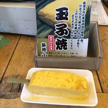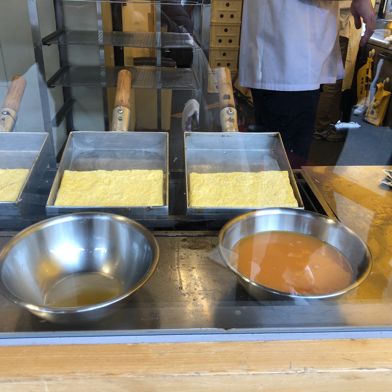 築地場外の買い出し中ひと休みして、出来立ての玉子焼きを頂きます。だし巻きと甘いだし巻きを選べます。どちらも100円。甘い方を好んで頂きますが、たった100円で幸せです。両方の食べ比べする方もみかけます。いつも行列ですが、回転が速いので見送る事なく並ばれたら良いでしょう。