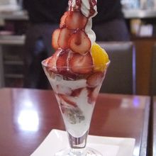 容器に、ソフトクリーム、苺スライス、オレンジ、コーンフレークを盛り、生クリームをトッピングし、苺ソースを掛けている。