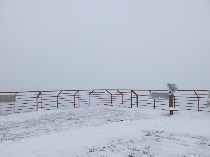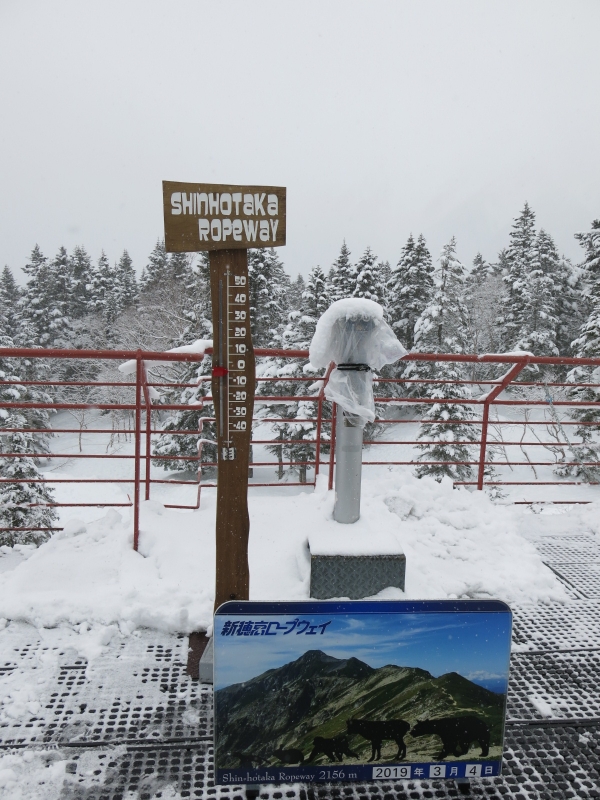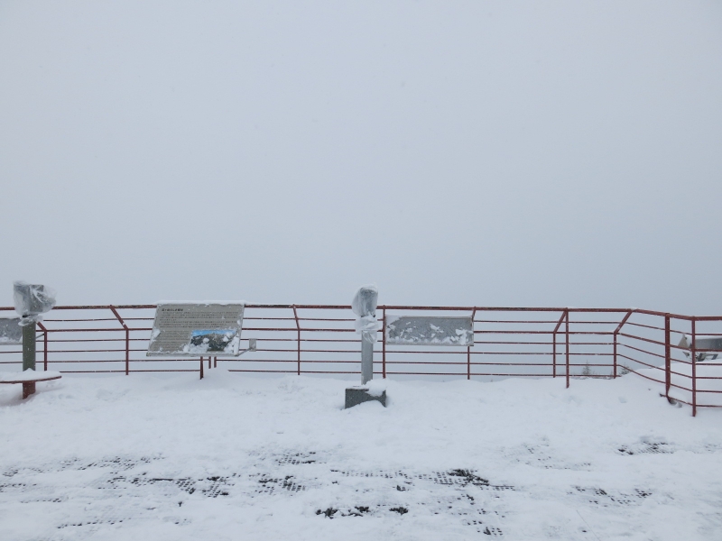 新穂高ロープウェイを乗り継いで山頂駅に到着、展望台に立てば眼前に広がる雄大な穂高連峰…のはずですが、訪問した時は曇天どころか雪!視界はほぼゼロでした。