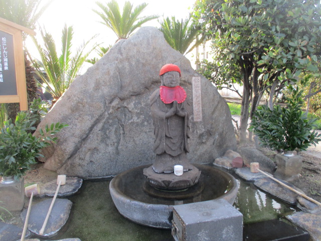 宍道湖しじみ館から一畑電車北松江線の線路に沿って、宍道湖温泉の外れまで行くと、このお湯掛地蔵さまはおられます。赤い布をかぶり、柔和な微笑みを浮かべて立っておられます。温泉地ならではのお地蔵さまで、是非お参りをして行きましょう。