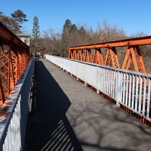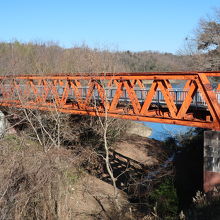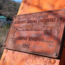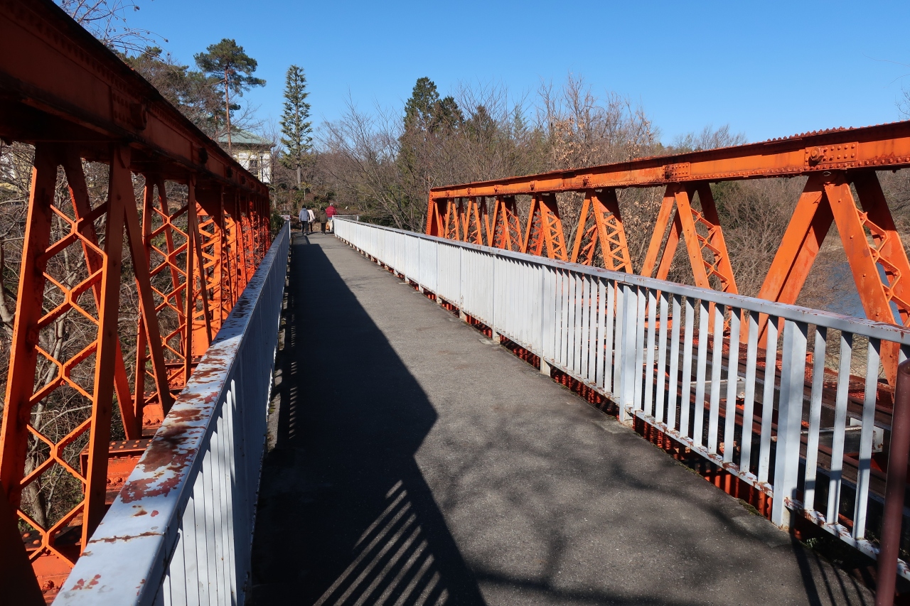 明治村4丁目の入鹿池側に掛けられたオレンジ色のトラスが美しい橋が六郷川鉄橋です。新橋-横浜間に鉄道が開通した5年後に多摩川に日本初の復線用鉄製鉄道橋として掛けられたものです。ですので、橋梁にはハミルトンズ・ウインザー・アイアンワークス社のプレートがつけられています。如何に文明開化時に外国に頼っていたかが分かる遺構です。