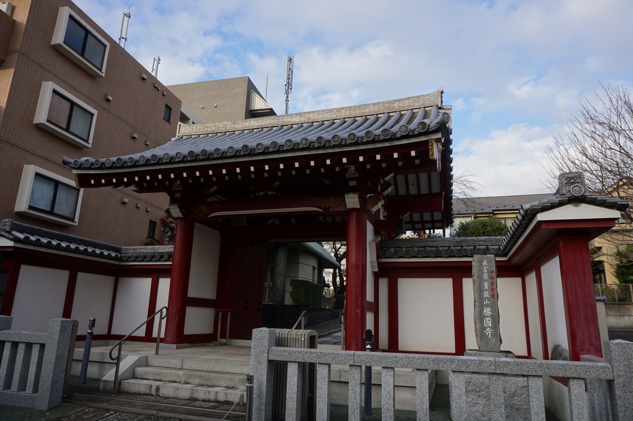 勝国寺は、国士舘大学のキャンパスのほとんど隣りといった場所。新義真言宗の寺で、世田谷城の裏鬼門に位置することから、鬼門除けのために薬師如来を祀ったのが始まり。