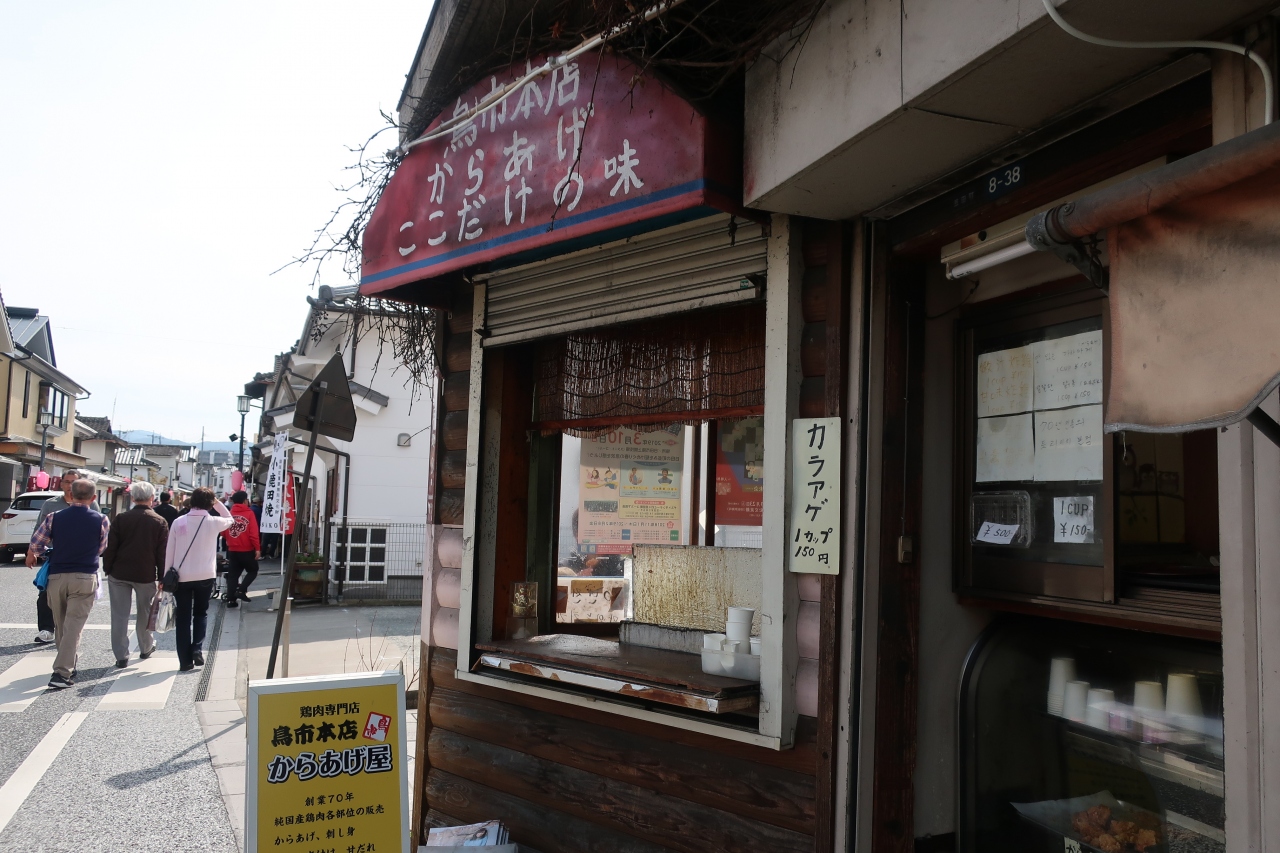 豆田町の通りにある鶏肉専門店で、ショーケースには鶏肉の各部位が並んでいます。その隣でから揚げを揚げていて揚げたてを買うことができます。カップで150円とお手軽値段、もみじといわれる鶏の足の煮物があるはずなのだが、この日はなく、代わりに手羽中の煮物があり、同じくワンカップ150円でこちらをいただきました。揚げて甘辛く漬けてありいい味になってました。手羽先でも手羽元でもなくその間の部位、手羽中といいます。