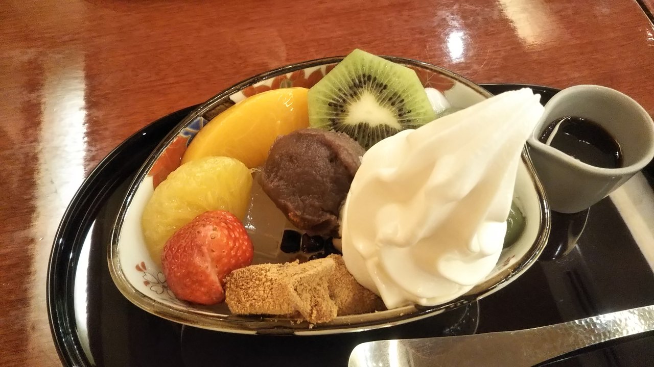 昔ながらのあんみつや白玉だんごにソフトクリームを添えて、安心できる美味しさです。