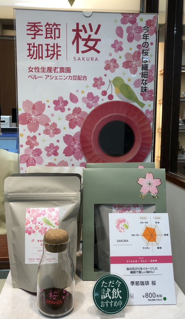 UCCカフェメルカード 千葉そごう店 で、コーヒー豆を購入しました。試飲させていただいたのは、季節珈琲のホワイトデーブレンドと桜です。どちらも100g800円でした。コーヒー豆の他にも、ストレート珈琲の一杯珈琲(ドリップコーヒーパック)も各種揃っていました。