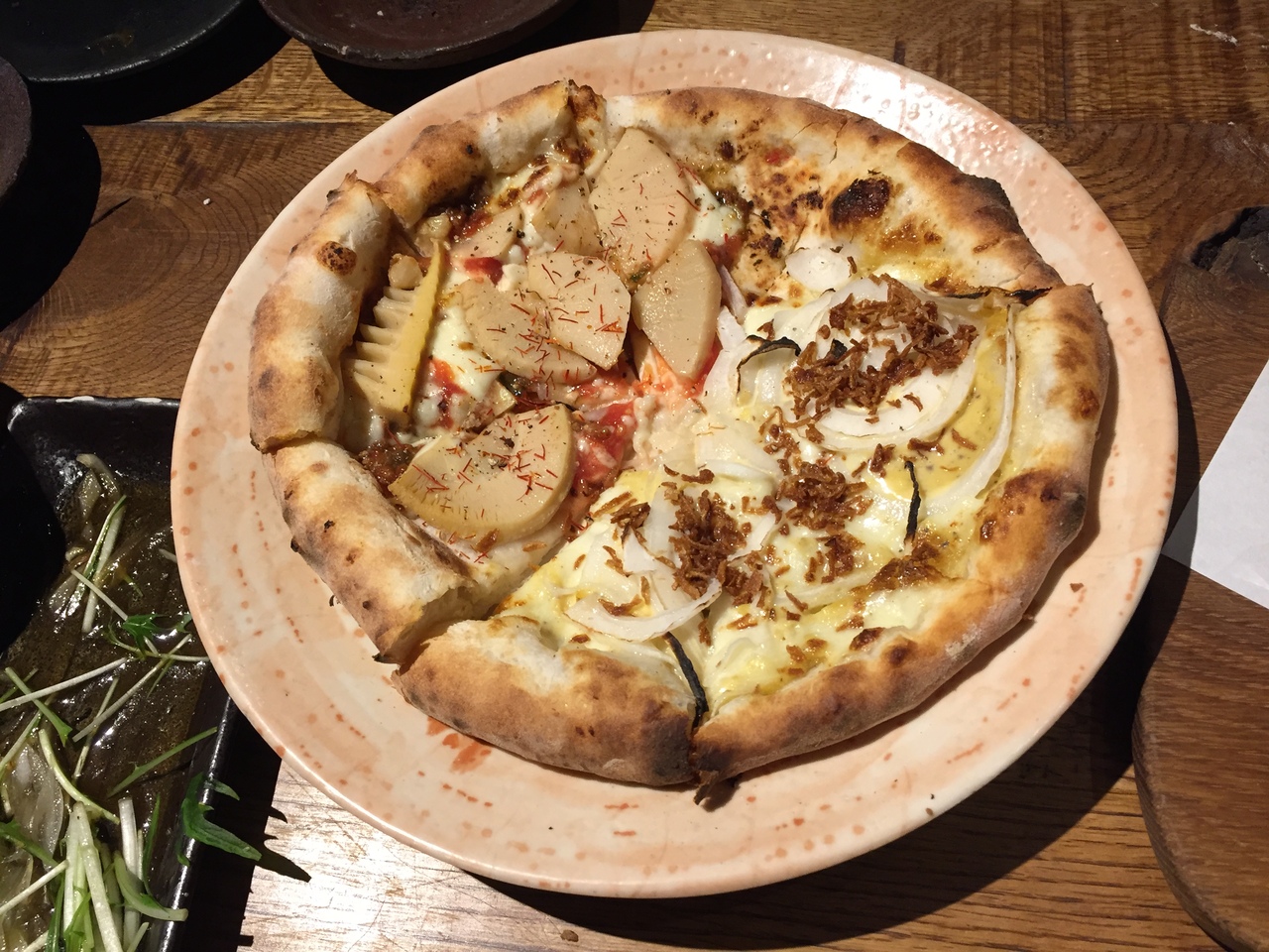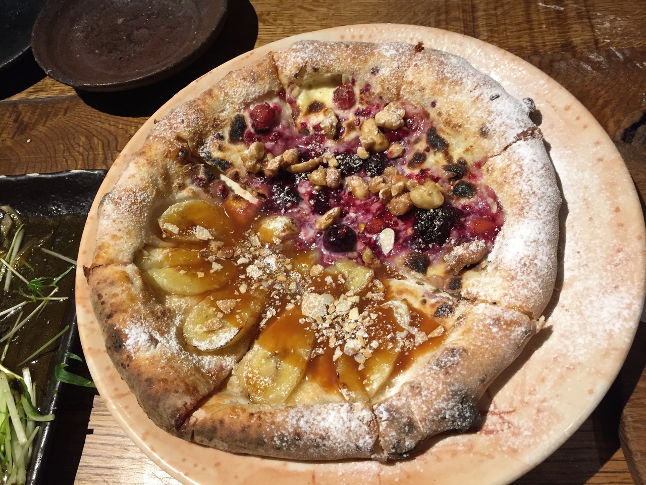 お料理はサラダ、カルパッチョ、唐揚げなど色々出て来ました。 石窯で焼くお料理が目玉なのか、野菜や枝豆まで焼いたお料理や、ピザがおかず系と最後のデザートピザと2種類。 おかず系ピザの、玉ねぎのピザがなかなか美味しかったです。 デザートピザは甘すぎて食後にはちょっとキツかったかな~。