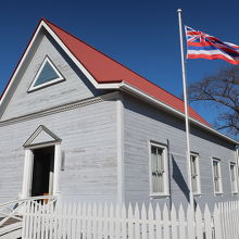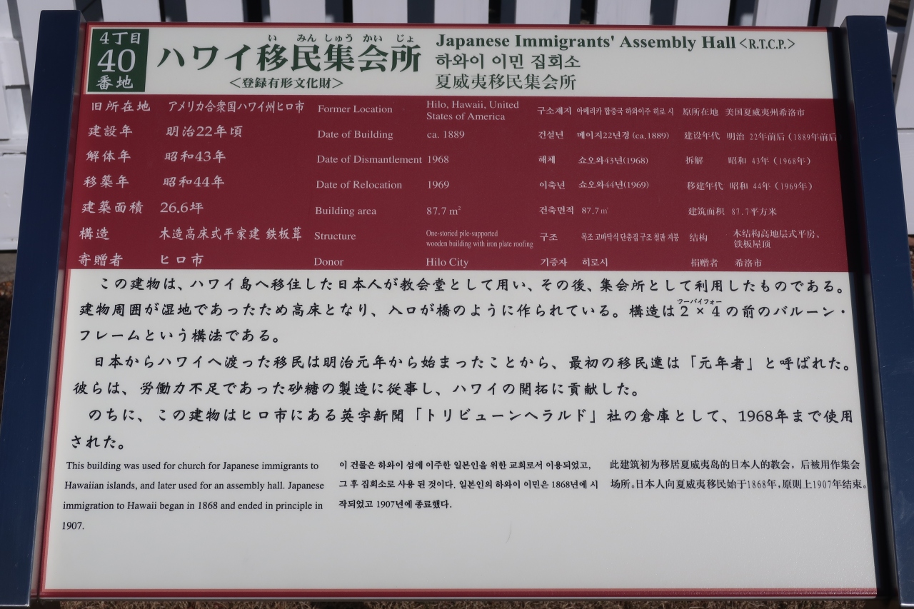 明治村4丁目には明治期に日本からの海外に移住した人が海外の地で建てた建物が3つ移築されています。その一つがハワイ移民集会所です。直方体のボックスに三角形の切妻屋根を載せただけの超シンプルな構造。あまりにもシンプルすぎて見ごたえがありません。内部ではハワイでの移民の姿が展示されていました。
