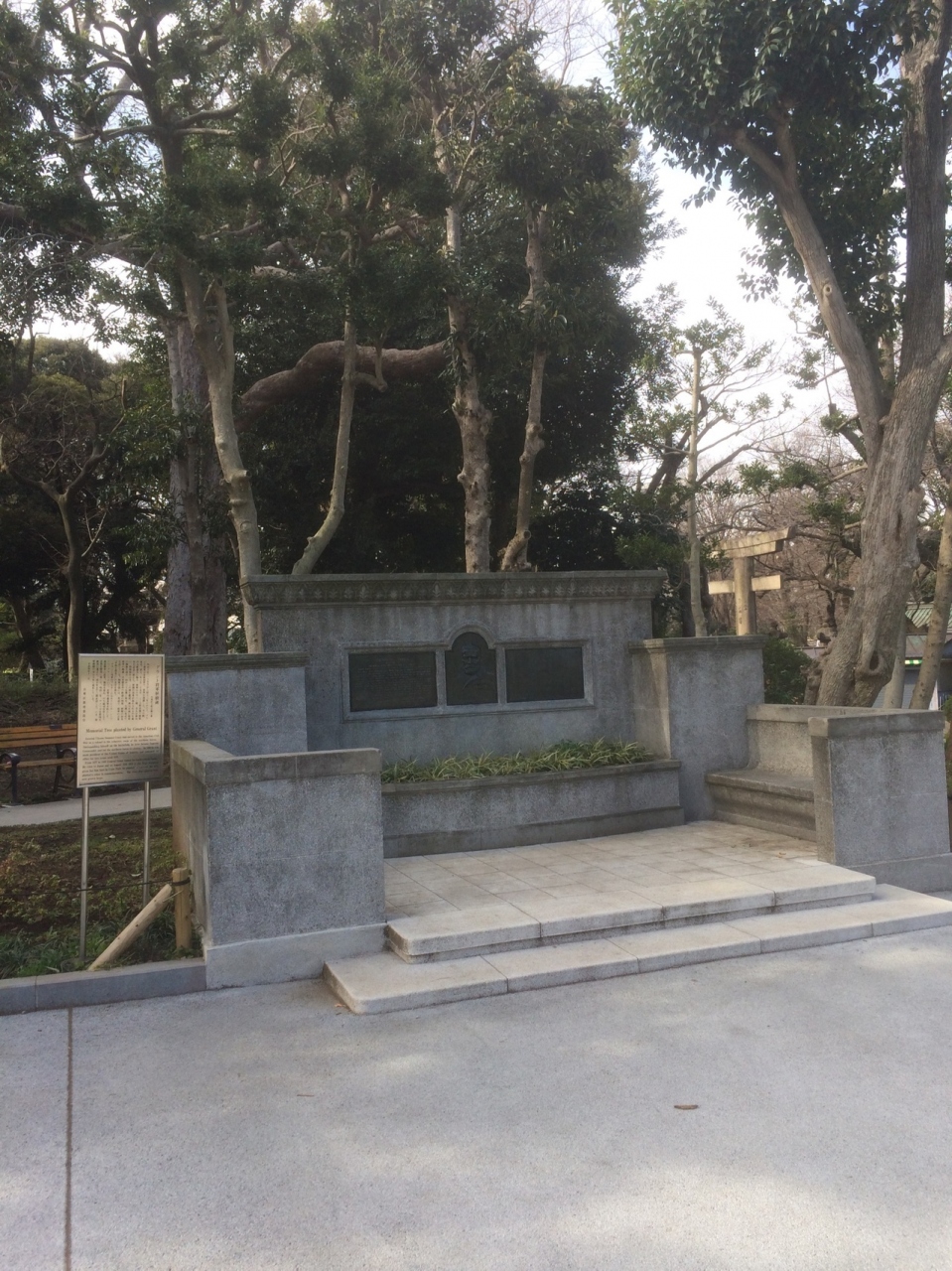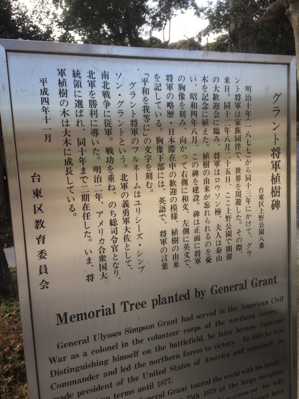 大きな横長の石碑でした。アメリカ南北戦争の北軍の総司令官で、のちにアメリカ大統領になった人で、日本には滞在したこともあるとのことでした。なるほど立派な石碑というのがわかりました。周囲は細長い木で囲んであります。