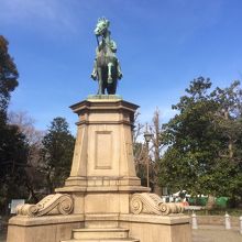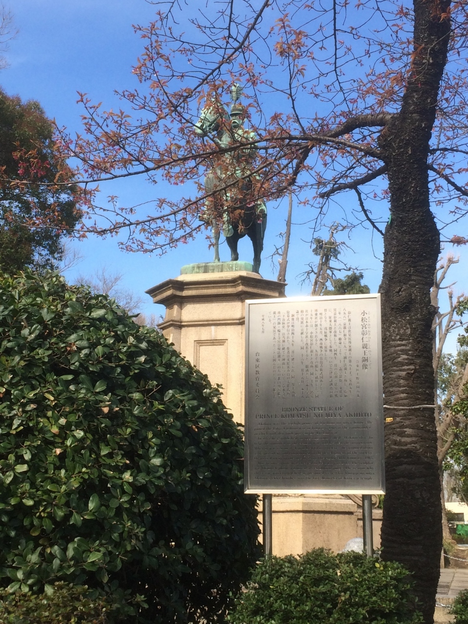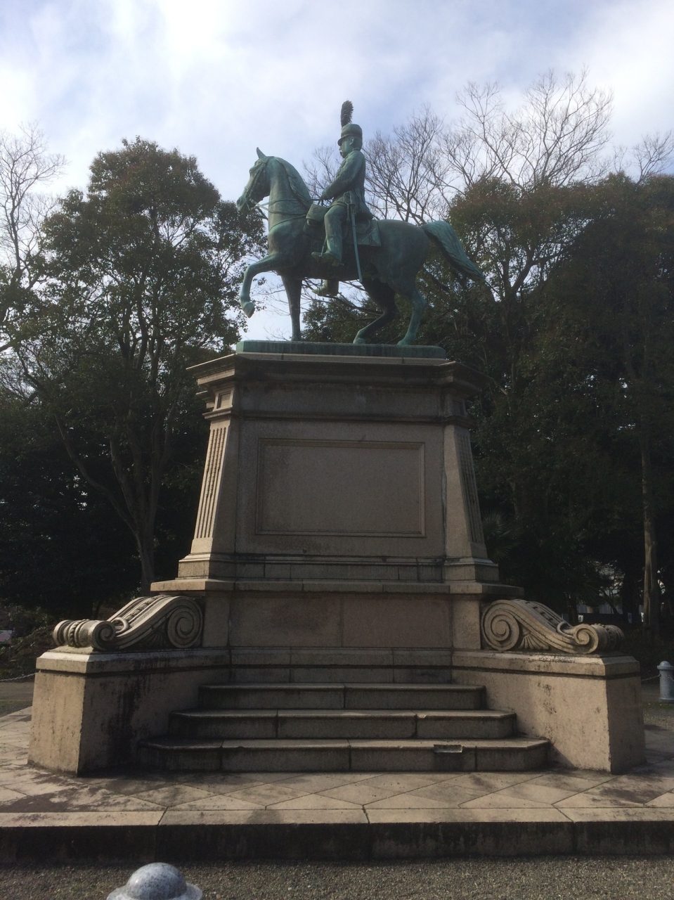 鳥羽伏見の戦いに征夷大将軍として参戦した人の像で、土台の石の上に馬に跨り、馬の左足が少し上がり行進しているような姿でした。人物像は軍服姿で帽子を被り、権威ある姿でした。高い位置にあるので見上げて見学となります。