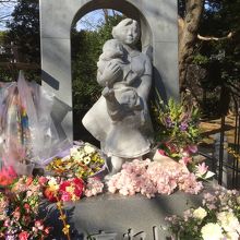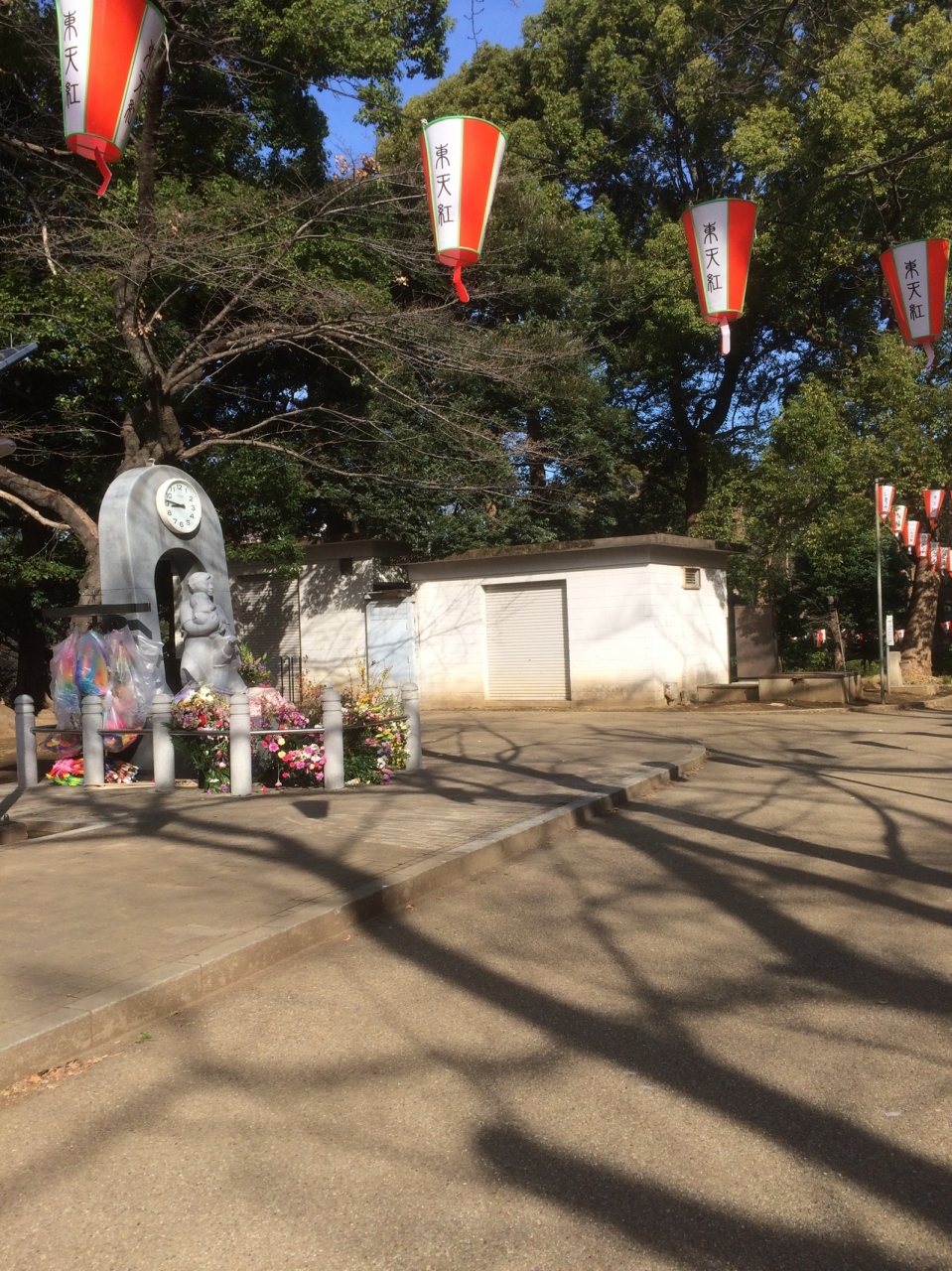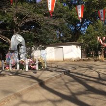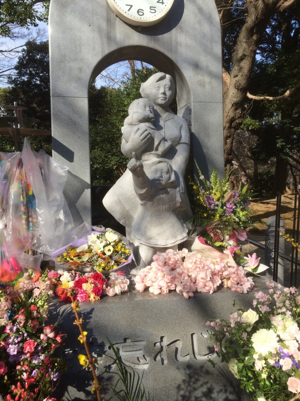訪問時は記念式典だったのでたくさんの花が供えられていました。母子平和像で、母が子供を抱っこしていて、母の顔は真顔でした。杭のようなものに、囲まれてグレーの像で上には時計がありました。上野公園内の通路沿いにあります。