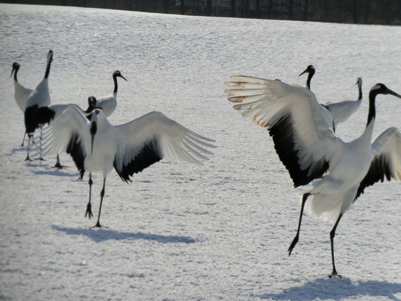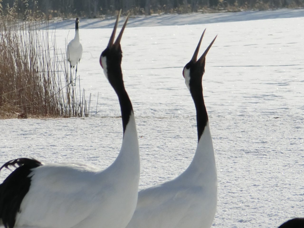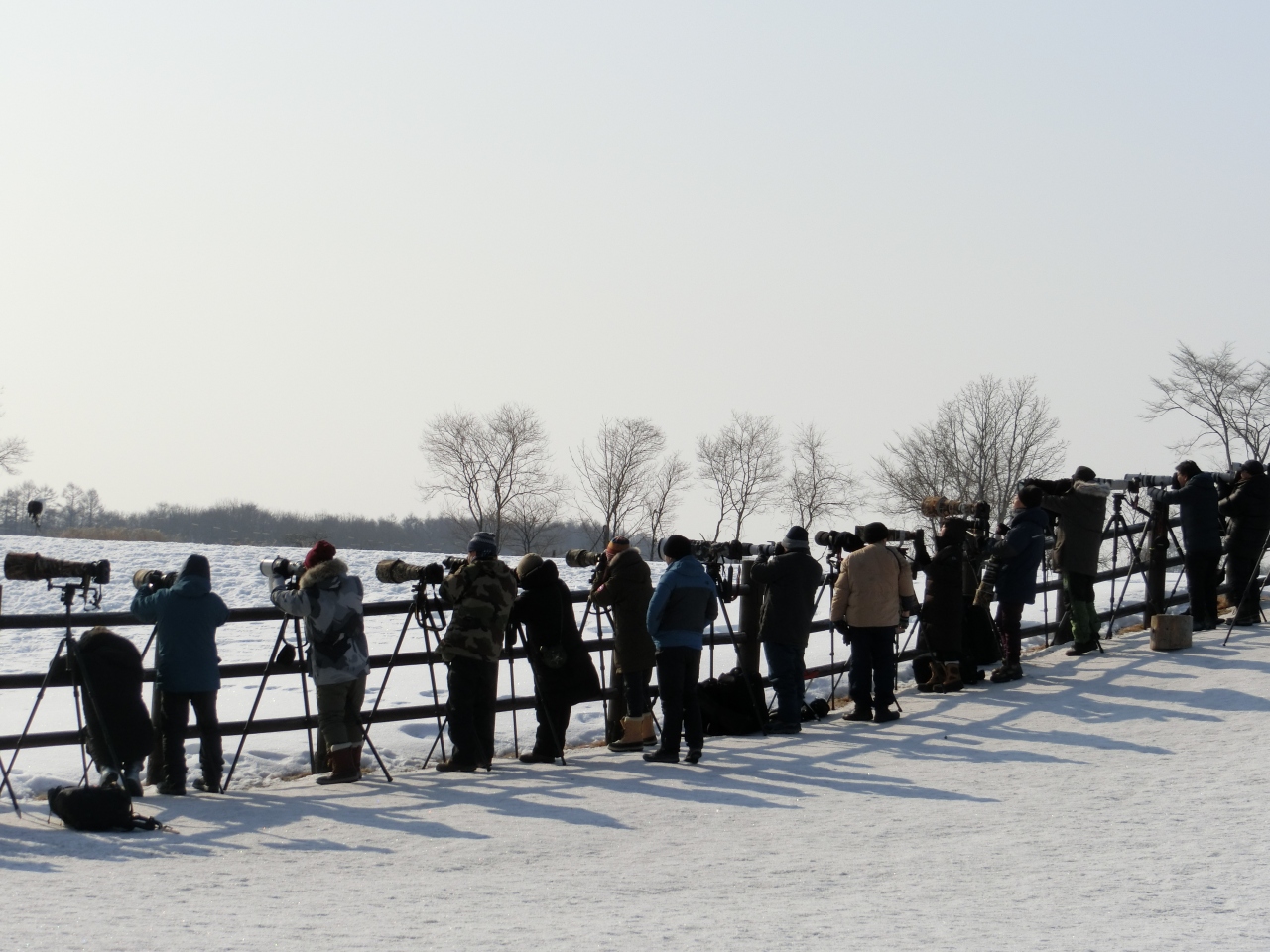 大きなカメラを持ったタンチョウファンがひしめくスポット。