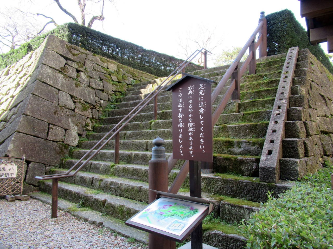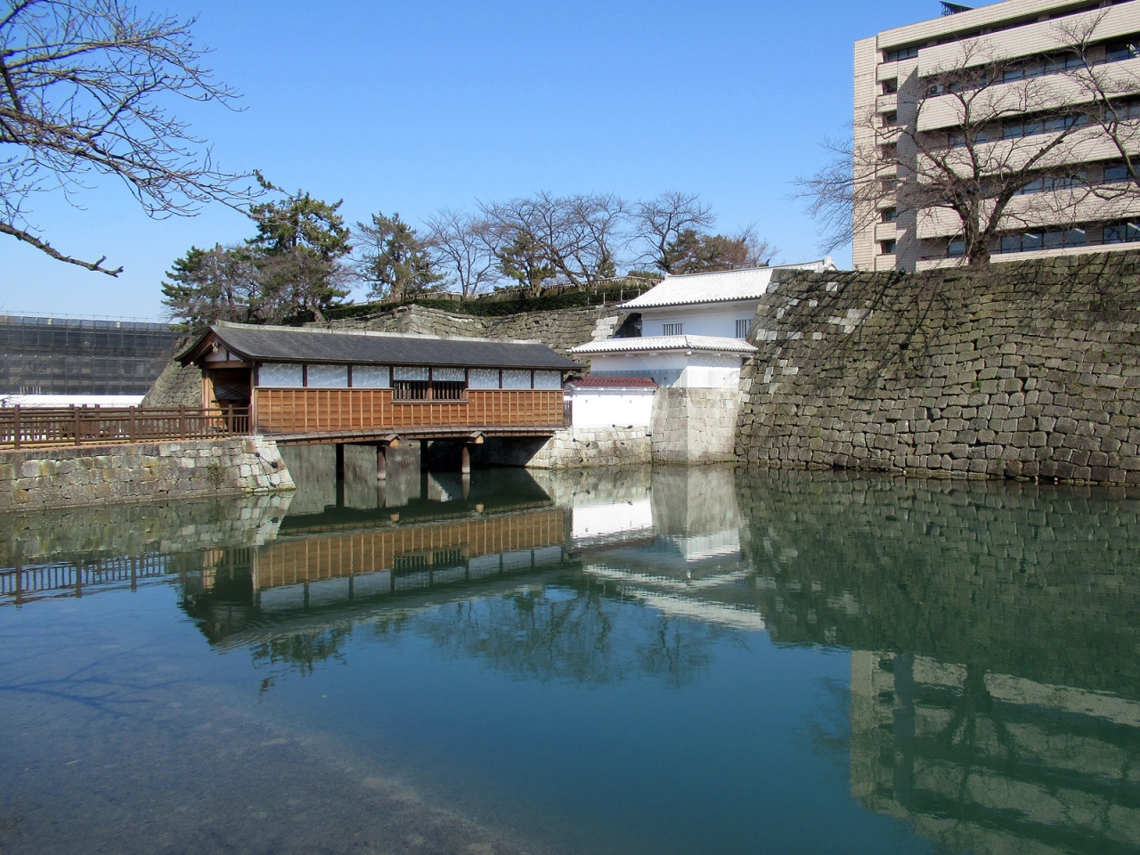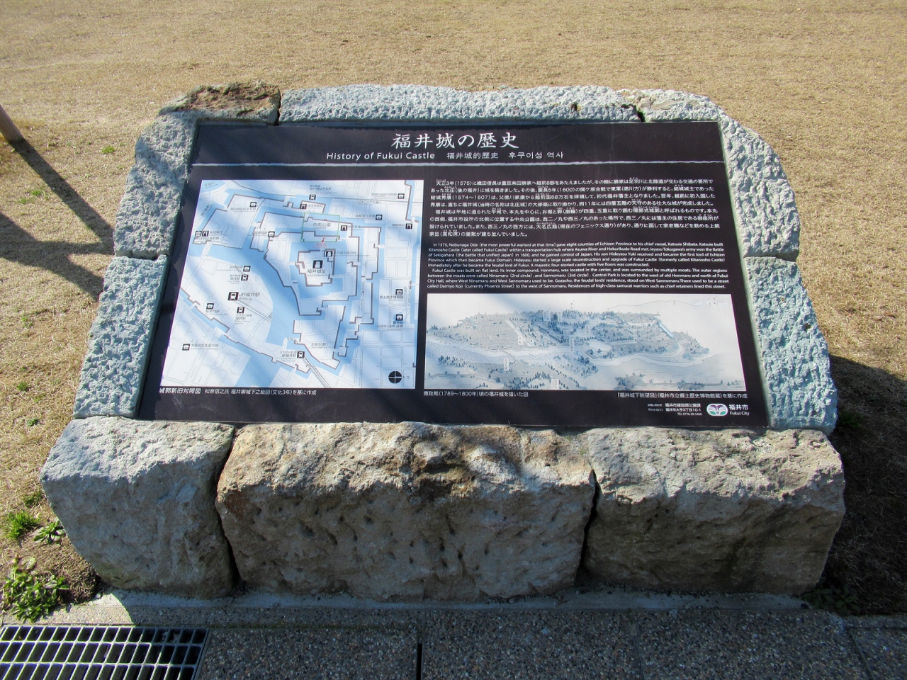 本丸の広さと立派な石垣、そして周囲の内堀だけを見ても、さすが越前68万石、往時はさぞかし壮麗な城郭であったことが容易に想像できます。復元された「御廊下橋」から「山里口御門」を通って天守台へ登ると、福井の語源となった「福の井」もあります。また「御廊下橋」側の美しい「中央公園」は西二ノ丸・西三ノ丸の跡で、笏谷石で堀が復元されていたり、藩主の御座所の間取りなどが表現されていました。