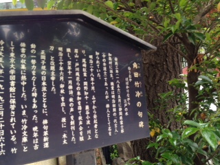 神田明神の境内の奥の方(神殿の裏のあたり)に、この句碑を見つけました。実は、この角田竹冷と言う人物をこの碑を見るまで知りませんでした。この句碑がきっかけとなり、この方に付いて学び、政治家であり俳人であったことを知りました。神田明神の境内にはこの様に興味をひくものばかりで、参拝以外にも楽しむ事が出来ると思います。