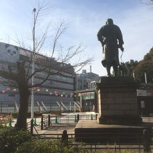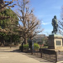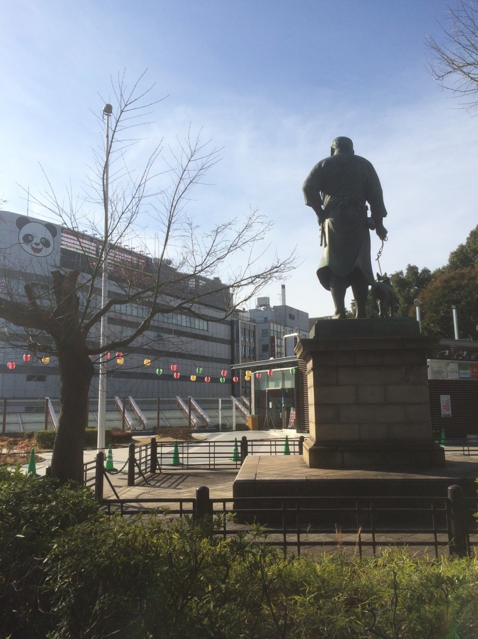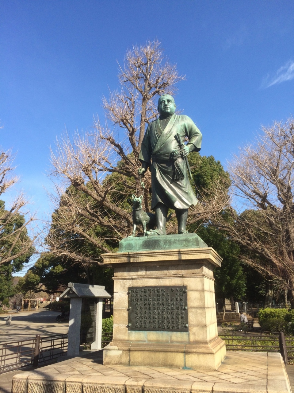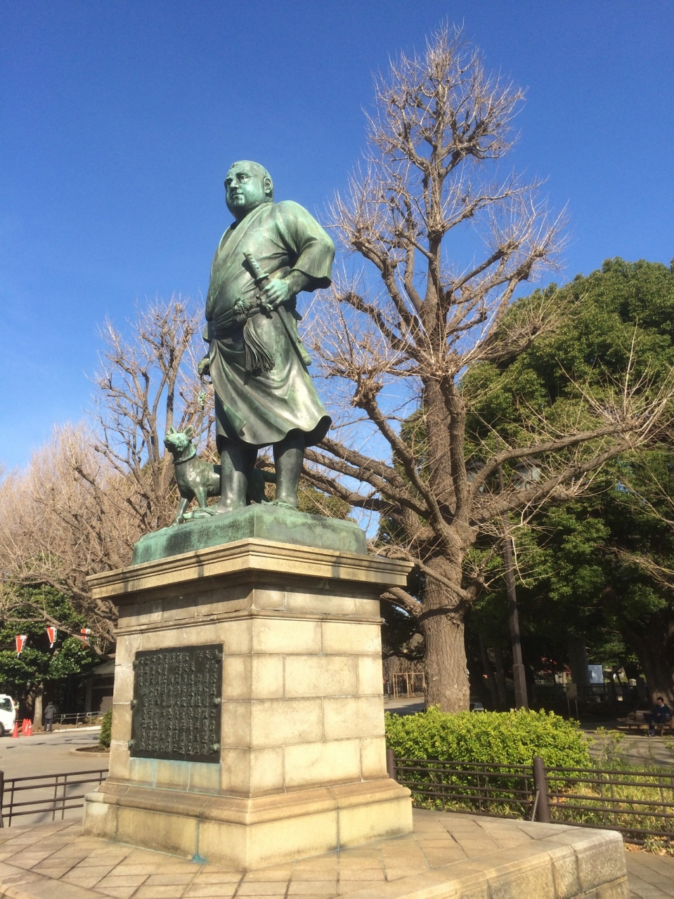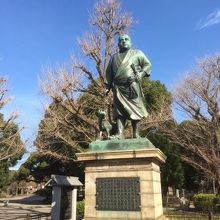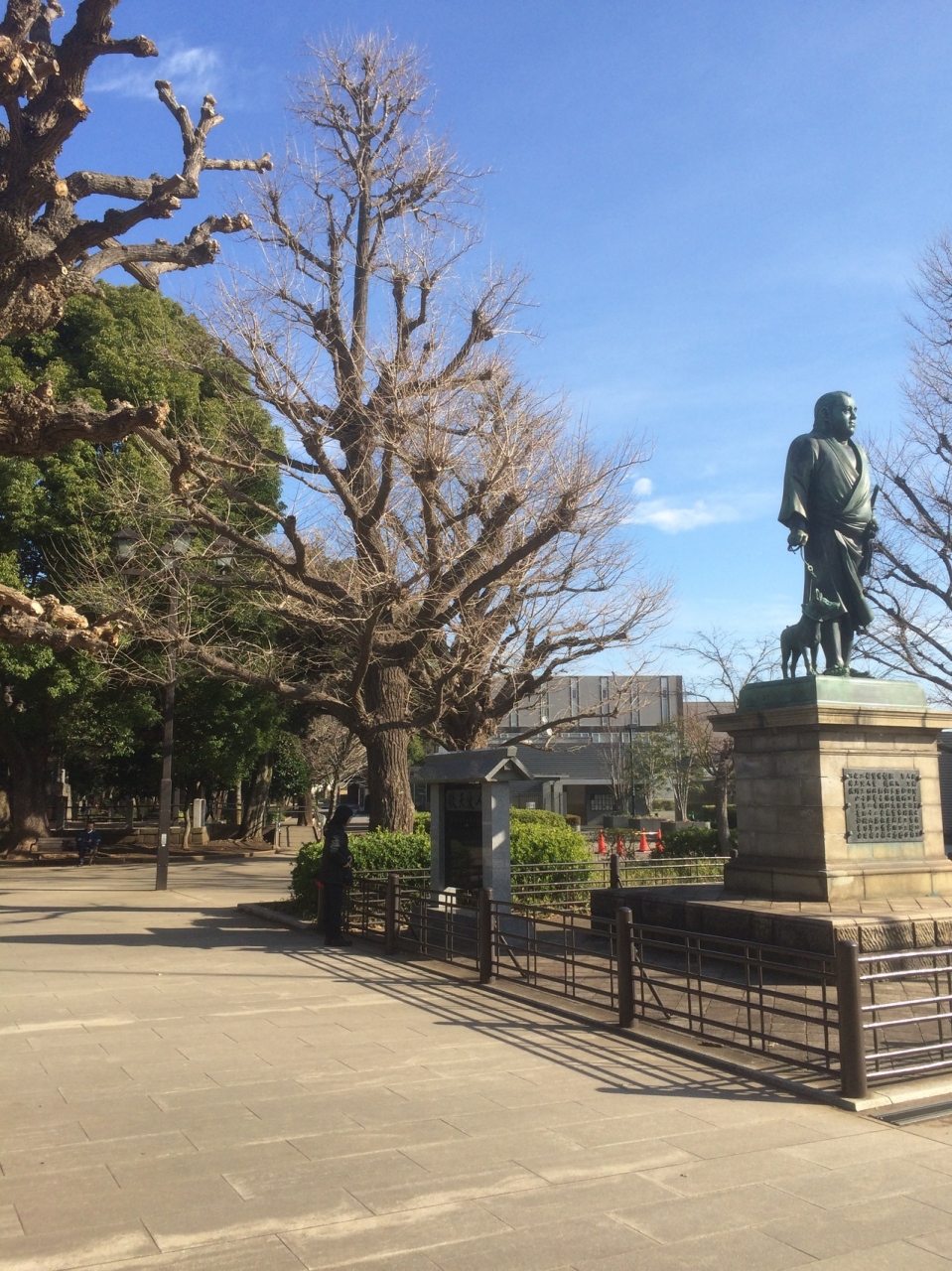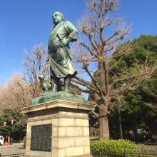 上野公園内の銅像はいくつかありますが、その中でも最も人が多い銅像でした。石の上にのっている巨大な像で、ラフな格好をして犬を連れ散歩でもしている姿でした。周りを囲いで囲み、銅像の下には文字が書いてありましたが読めませんでした。