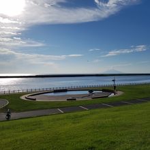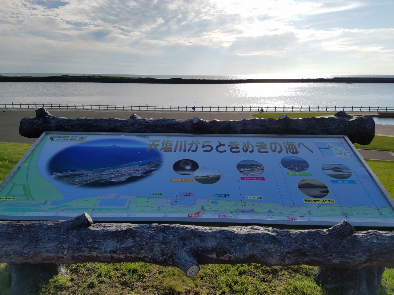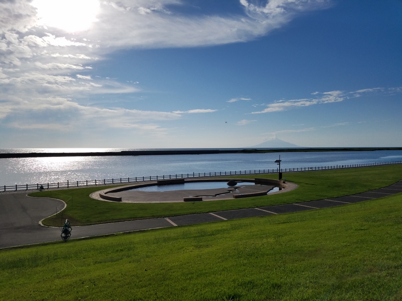 天塩川河川公園は、天塩川が日本海に注ぎ込む河口から海沿いに広がる大きな公園です。芝生がきれいに敷き詰められています。風が強く真夏ながら肌寒さを感じながらも、ちょうど夕暮れ時で、利尻富士の美しい稜線に夕日が沈みこんでいく景色を楽しみました。