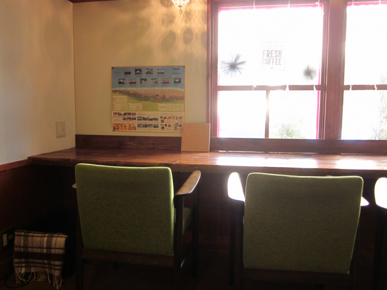 床はフローリング仕上げでテーブルと椅子の所だけふかふかのログが敷かれて、足元が気持ち良いほど暖かいです~。