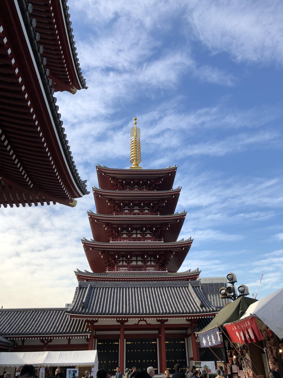 仲見世通りを進んでいくと、左側に浅草寺の五重の塔が見えます。やはり美しく絵になる建造物だなと改めて思いました。塔の一番上にある金色の装飾物も青空に映えてきれいでした。外国人観光客にも人気の撮影スポットです。