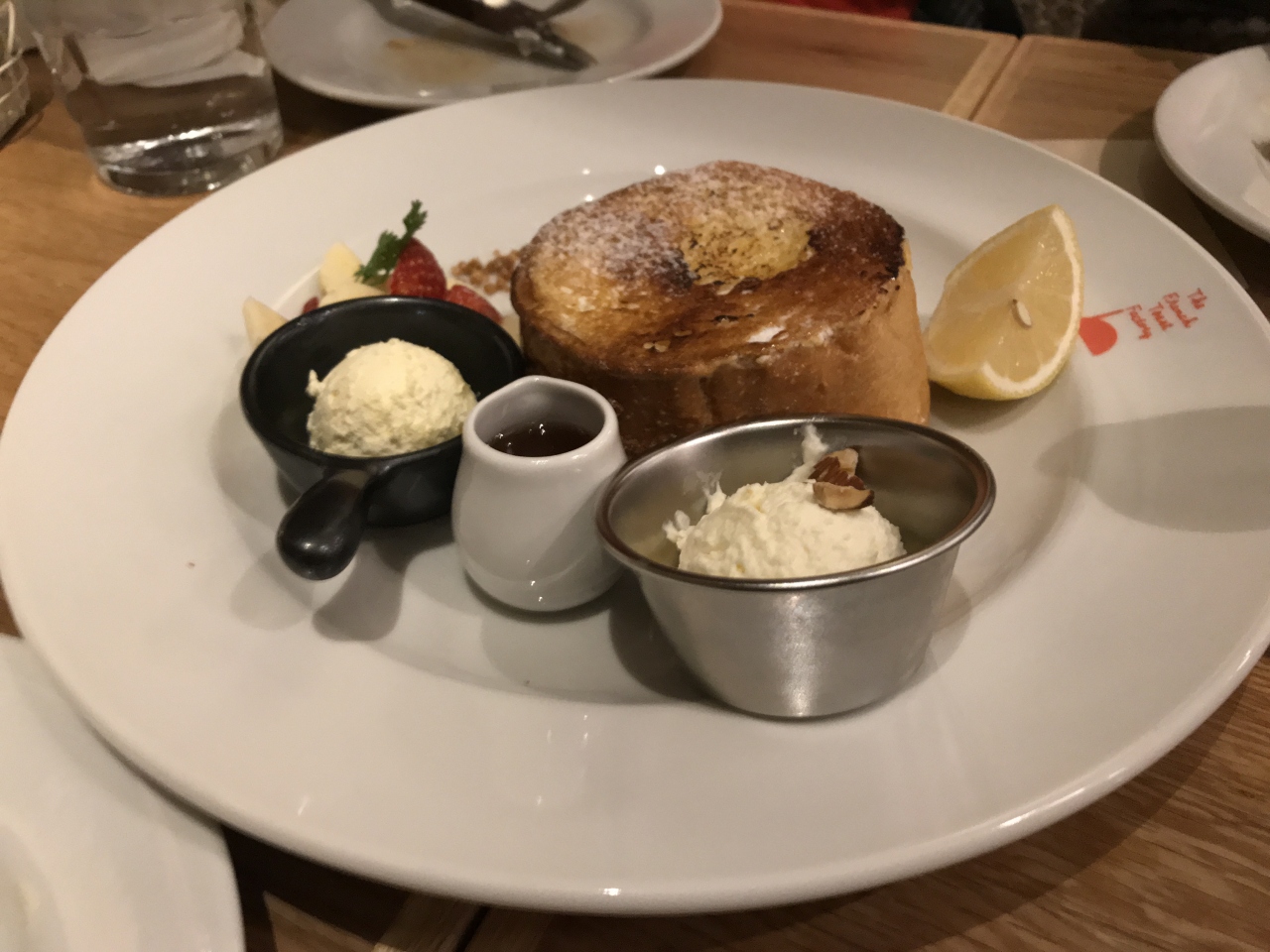 都立大学駅からすぐです。夕食で利用しました。フレンチトーストが看板商品ですが、パスタやピザなど食事メニューもありました。