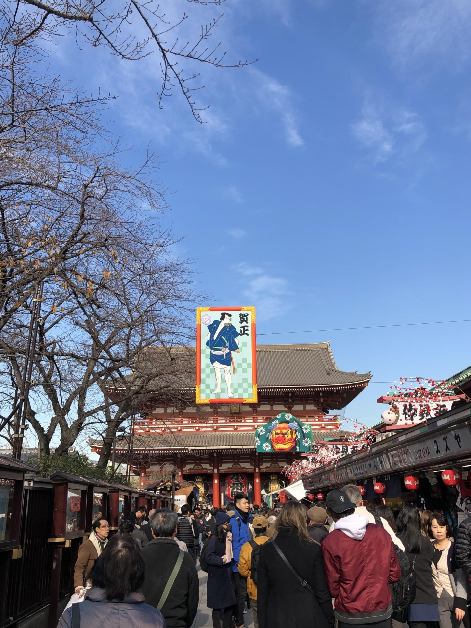 雷門を抜けて浅草寺まで続くメイン通りです。通りの両脇にはお土産屋さんや食べ物屋さんなどが並び、かなり観光客で混んでいます。12月の中旬頃に行ったので、本堂前の宝蔵門前あたりでは羽子板やお正月グッズの露店が並んでいました。