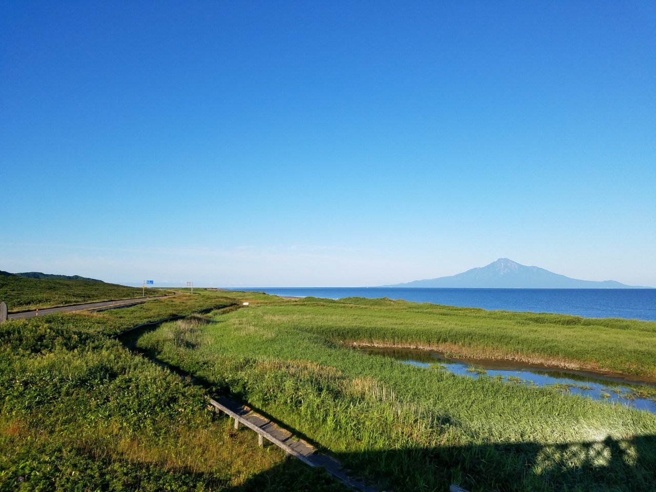 天塩からオロロンラインを北上し抜海の手前、海側に建物が見えてきます。こうほねの家と呼ばれる休憩施設で屋上は展望台になっています。美しい利尻富士、荒涼とした丘陵と滑らかな海岸線、その間をまっすぐに進む道、素晴らしい景色が広がります。規模は小さいですが木道の散策路もあり小さな池と湿原の植物を見て回りました。