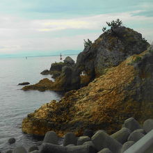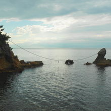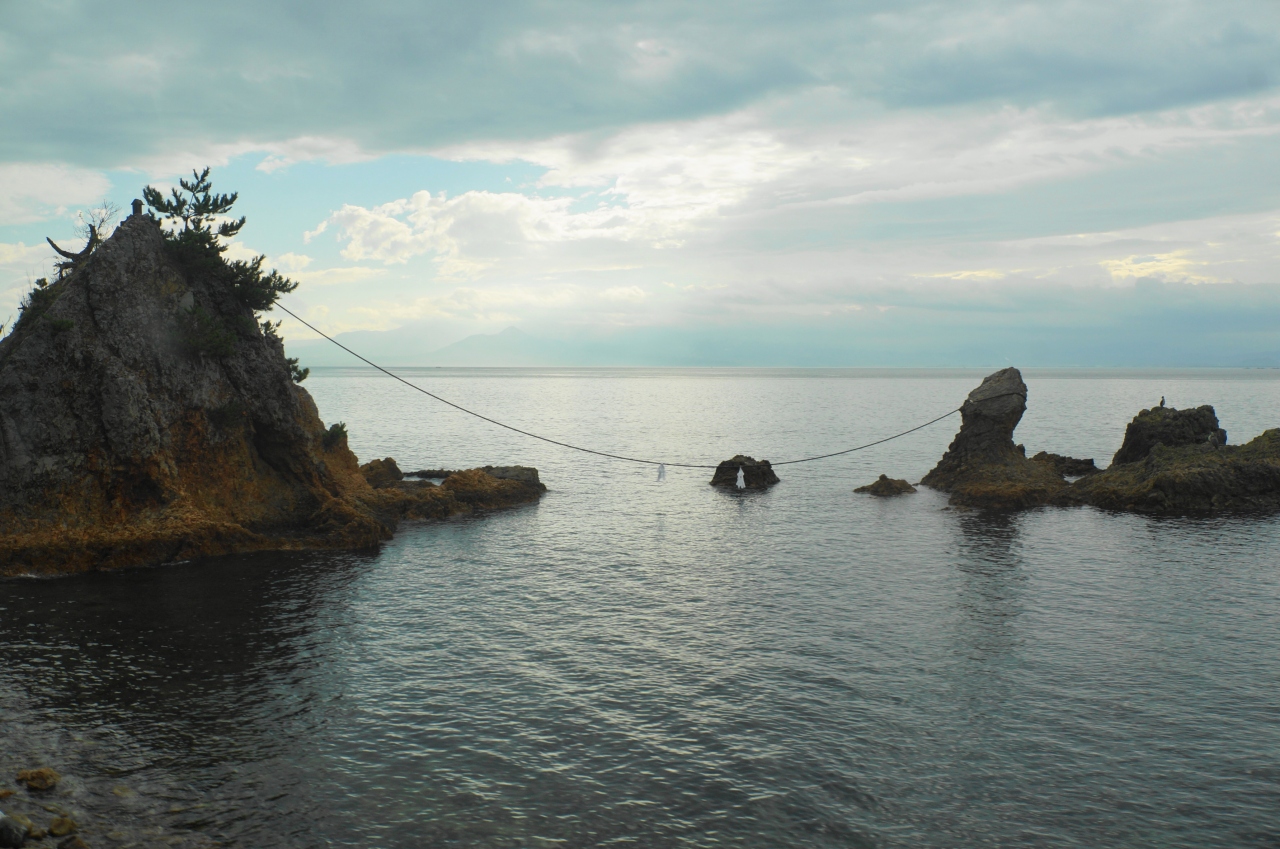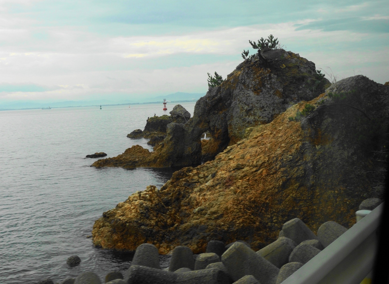 美保神社のお参りを終え、コミュニティバスで帰る途中、海岸線から男女岩(めおといわ)が見えました。