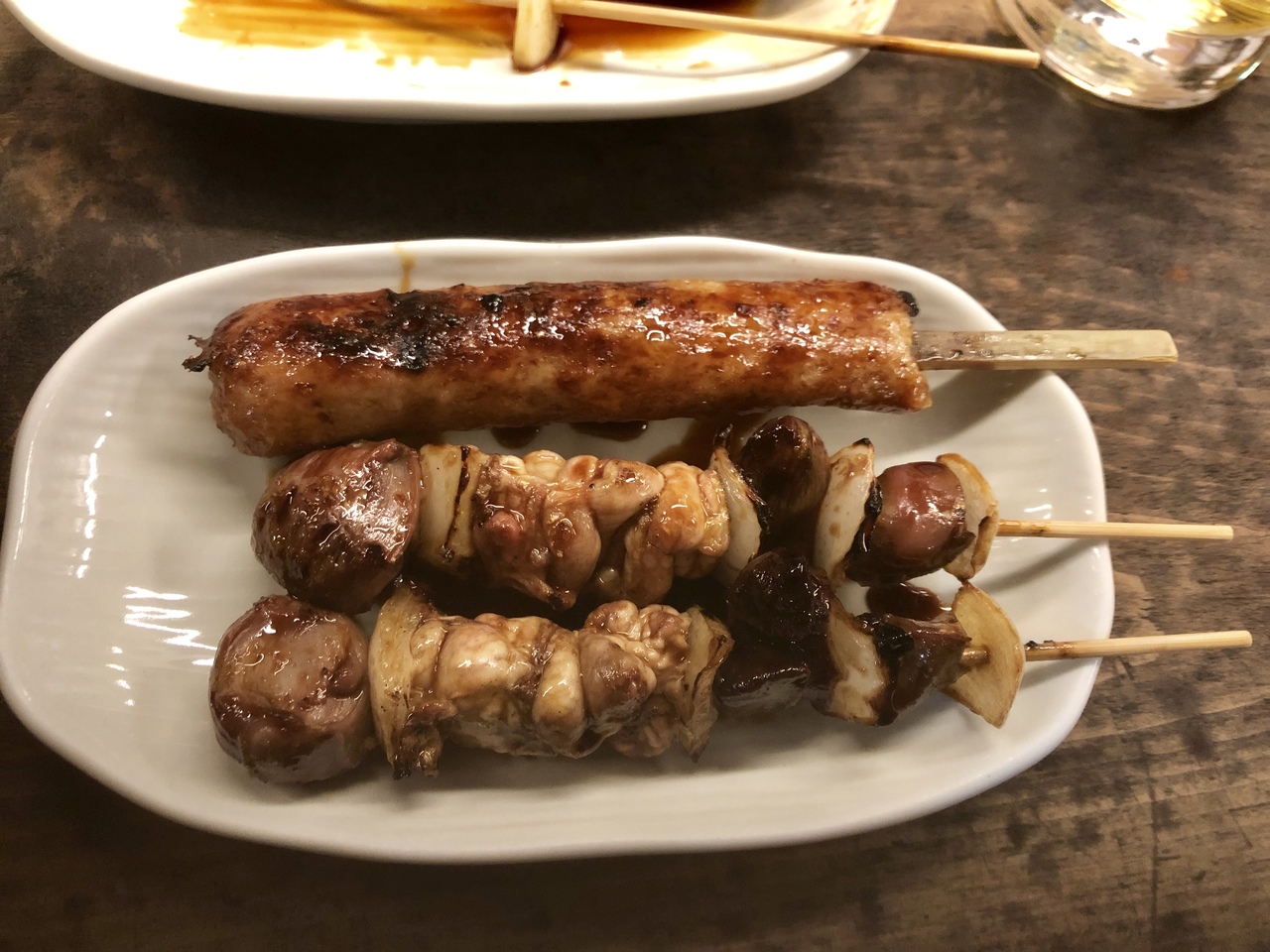フードが即ラストオーダーとのことで・レバ(2本)洋風つくね(1本)鳥肝(2本)