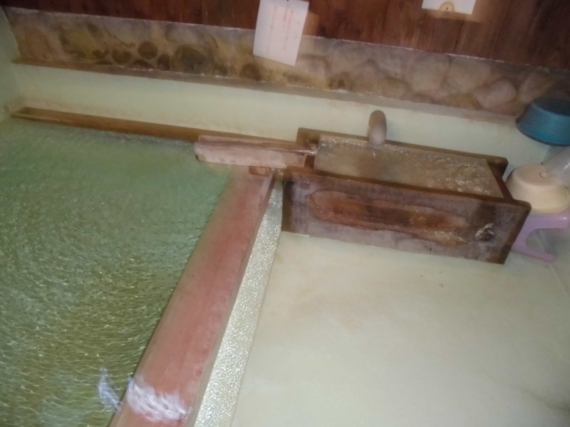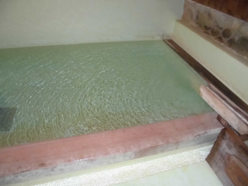 パット見、青緑っぽい色の綺麗な湯でしたが、浴槽のペンキの色が水色でそのため青緑っぽく見えただけでした。しかし湯船からの溢れだしもあり、薄濁りの新鮮そうな温泉でした。
