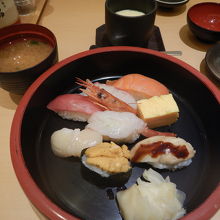 食べ放題にしてもあまり食べられないから、ランチメニューが食べられる時間なので、そちらにした。たぶん「花御膳」というメニューを注文したように思うが、店舗のサイトにはその名前のメニューがない。似たような内容のメニューはあるのだが、内容は多少異なる。内容は寿司7巻に卵焼き、みそ汁、茶わん蒸しで1501円。(クリエイトレストランツホールディングスの株主優待で1500円支払い)