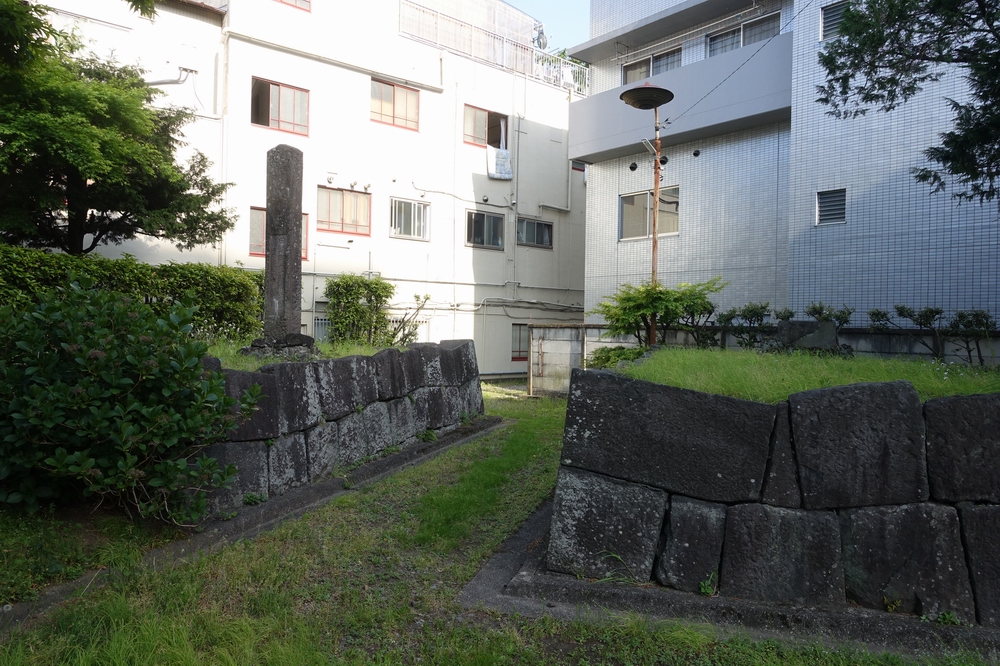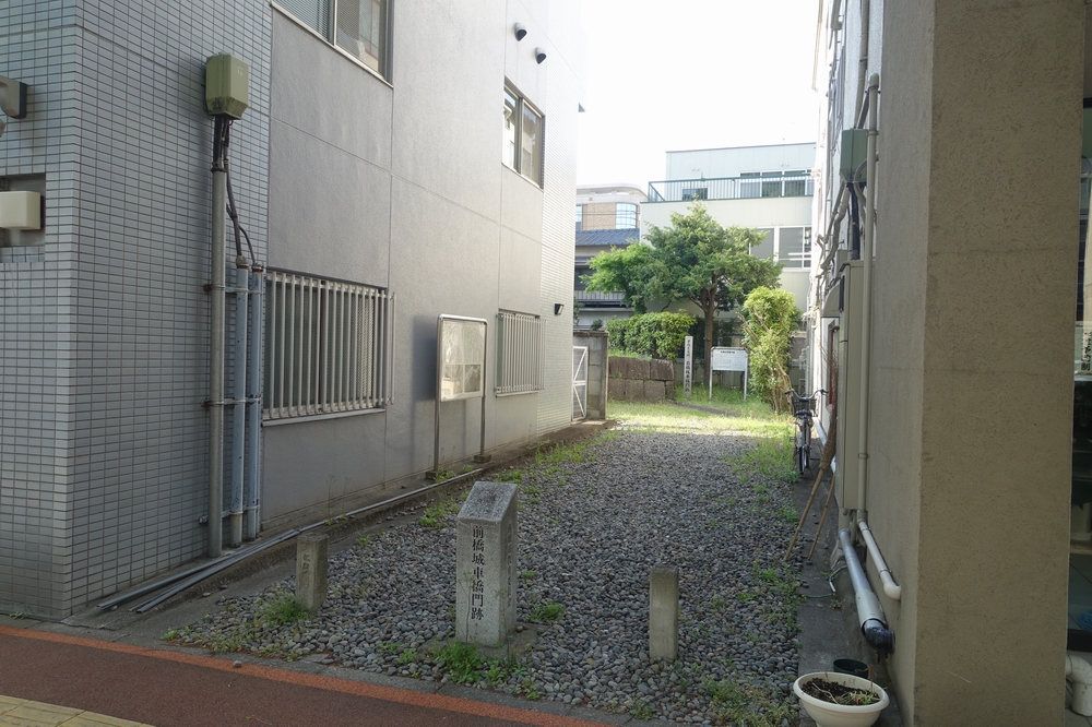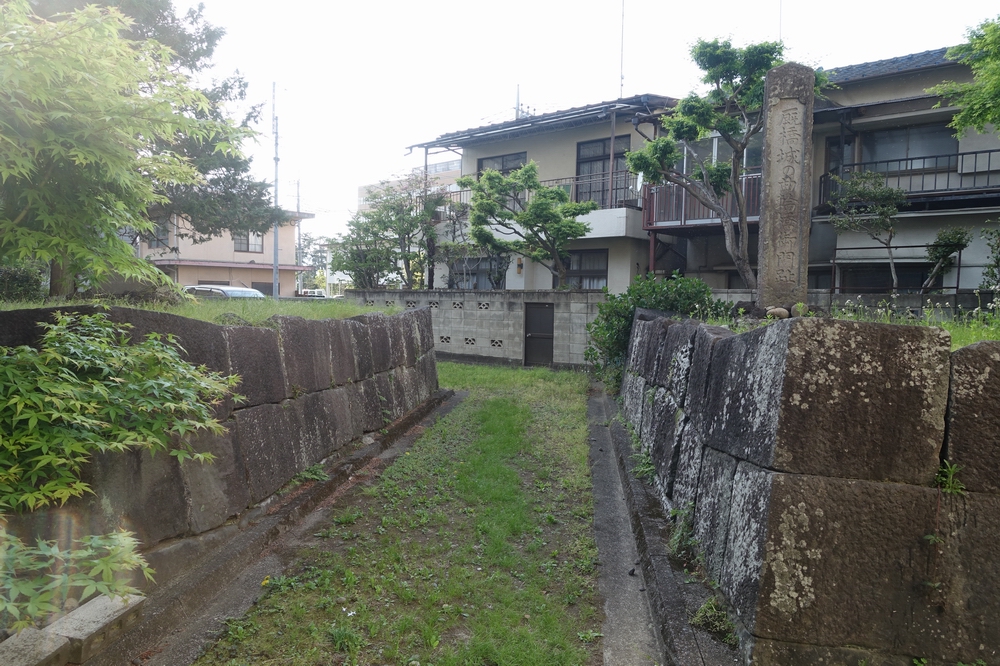 もともと渡り型の櫓門だったそうですが、現在残っているのは門の土台となる石垣のみ。左右の石垣の間隔が狭いなと思ったら、区画整理事業で西側の石垣が8mも東へ移動していると説明板に書かれていました。保存するにあたりいろいろ事情はあったのでしょうけど残念ですね。