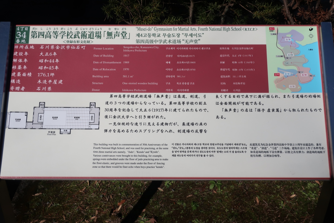 明治村4丁目の最南部にある大きな平屋の建物が第四高等学校武術道場 無声堂です。大正6年に金沢の第四高等学校の建てられた武道場は柔道、剣道、弓道の三道の道場を兼ねています。柔道一直線に出てきた様な道場で、柔道をやっていた私にとっては趣があり、こんな道場で稽古したかったと思える建物です。訪れた際はテレビドラマの撮影のロケが行われてました。