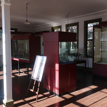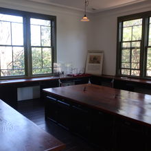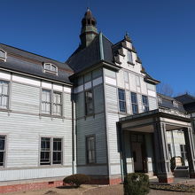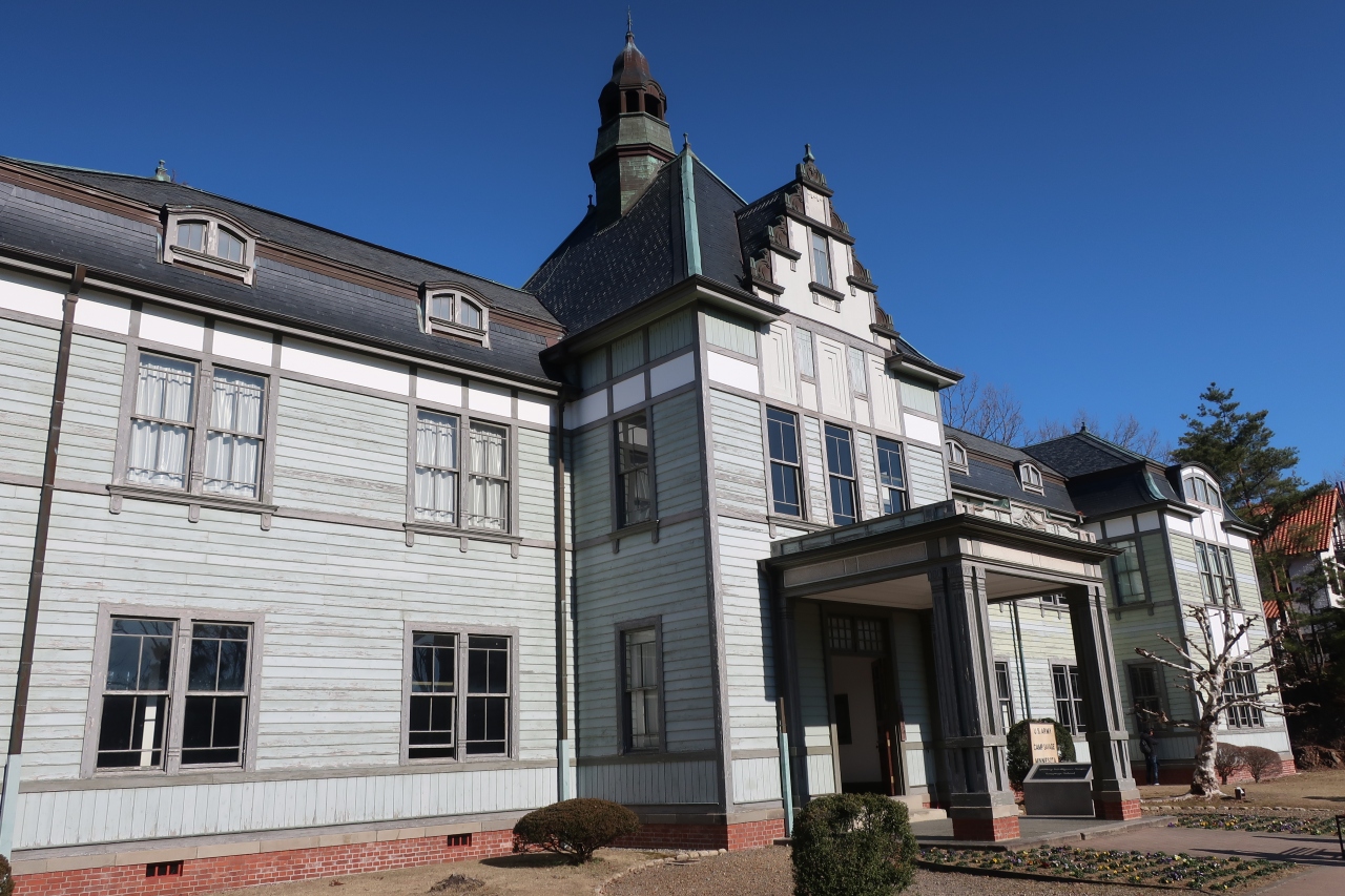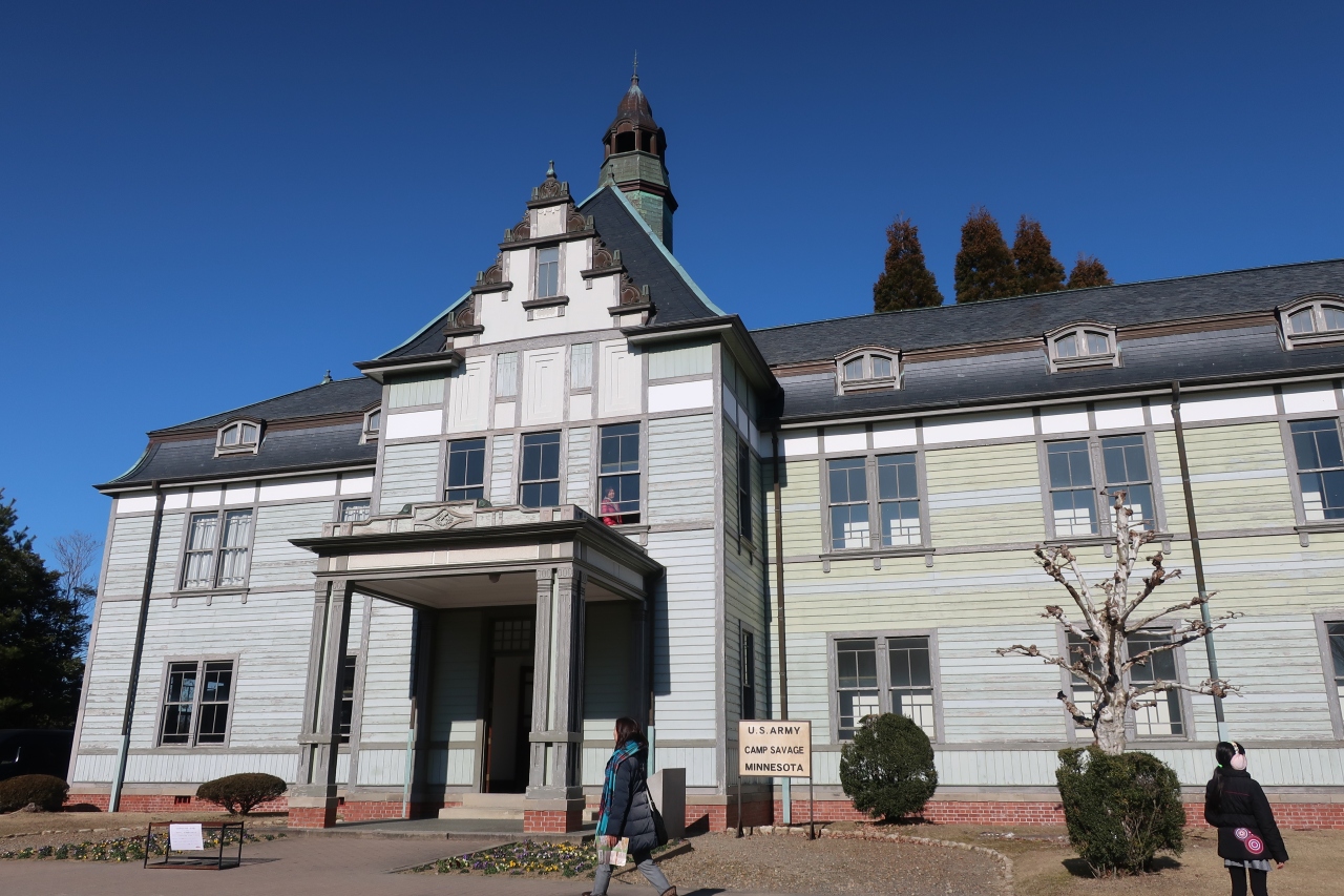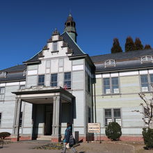 明治村3丁目の東側にある大きな洋館が北里研究所本館 医学館です。日本の細菌学の権威 北里柴三郎によって大正4年に白金に建てた研究所の本拠地とした建てたものを移築したもの。内部には理科室の様な部屋や、白衣の掛けられた部屋があり、当時の研究所の様子が再現されています。訪れた際はテレビドラマ「二つの祖国」の撮影で海外の病院と言う設定で使われていました。米兵の姿をしたエキストラの人が立つと、確かに海外の古い病院の様に見えます。