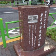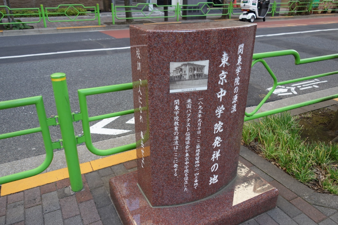 築地や月島あたりのエリアを散策中こちらへ立ち寄りました。居留地中央通り沿いの歩道に東京中学院発症の地であることを示す石碑が置かれていました。関東学院の前身となる学校で、外国人居留地が有った明石町に米国バプテスト伝道協会が設立したものだそうです。