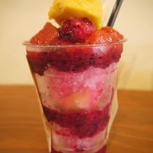 かき氷に、ピタヤをたっぷりと使っていて(したがって赤い)、甘酸っぱい。