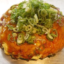 ベーシックなお好み焼(肉玉そば)に、玉子ダブル、イカ天、大葉、ネギかけを追加したもの。