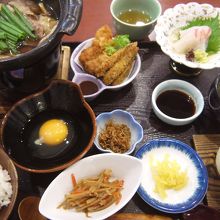 他に、おかずとして、小魚のフライ、鶏唐揚げ、茶碗蒸し、刺身の盛り合わせが提供され、縮緬雑魚と金平牛蒡、そして香の物の小鉢、そして味噌汁まで提供された。かなり充実した内容。ご飯が足りない、と思ってしまった程。