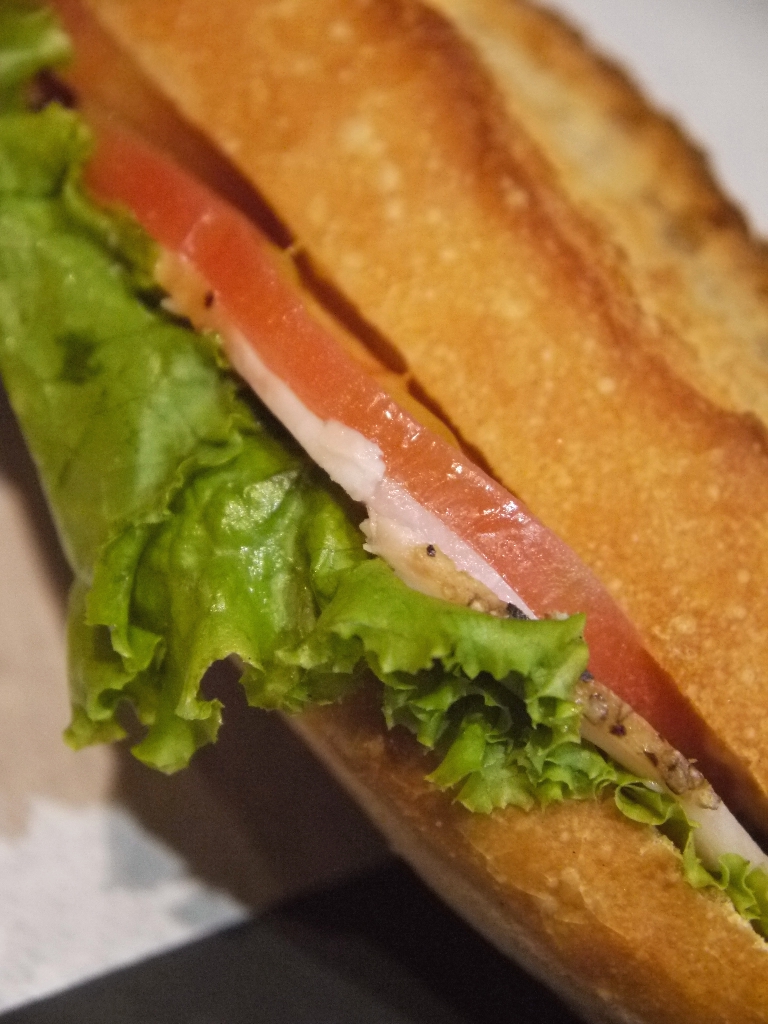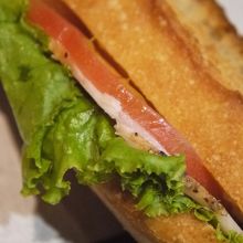 フランスパンに、ポークパストラミ、レタス、トマトを挟んでいる。