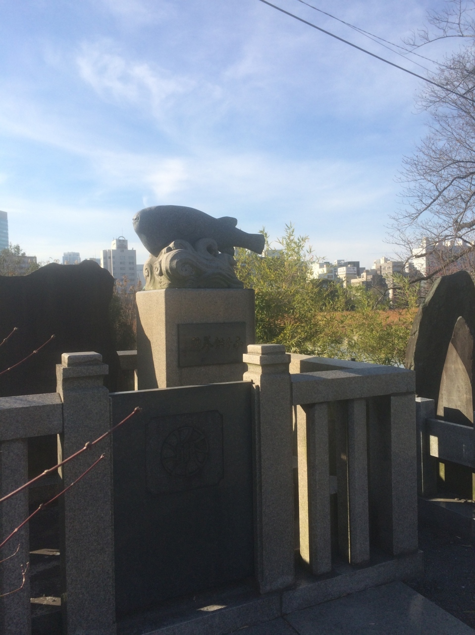 そういえば上野公園の周辺の繁華街では、いくつかのフグ料理屋を見かけました。それとは関係ないかも知れませんが、四角い石の上にフグの石碑がありました。フグの下は波の形をしていてリアルな石碑でした。周りは石で囲ってあるので、少し離れての見学でした。