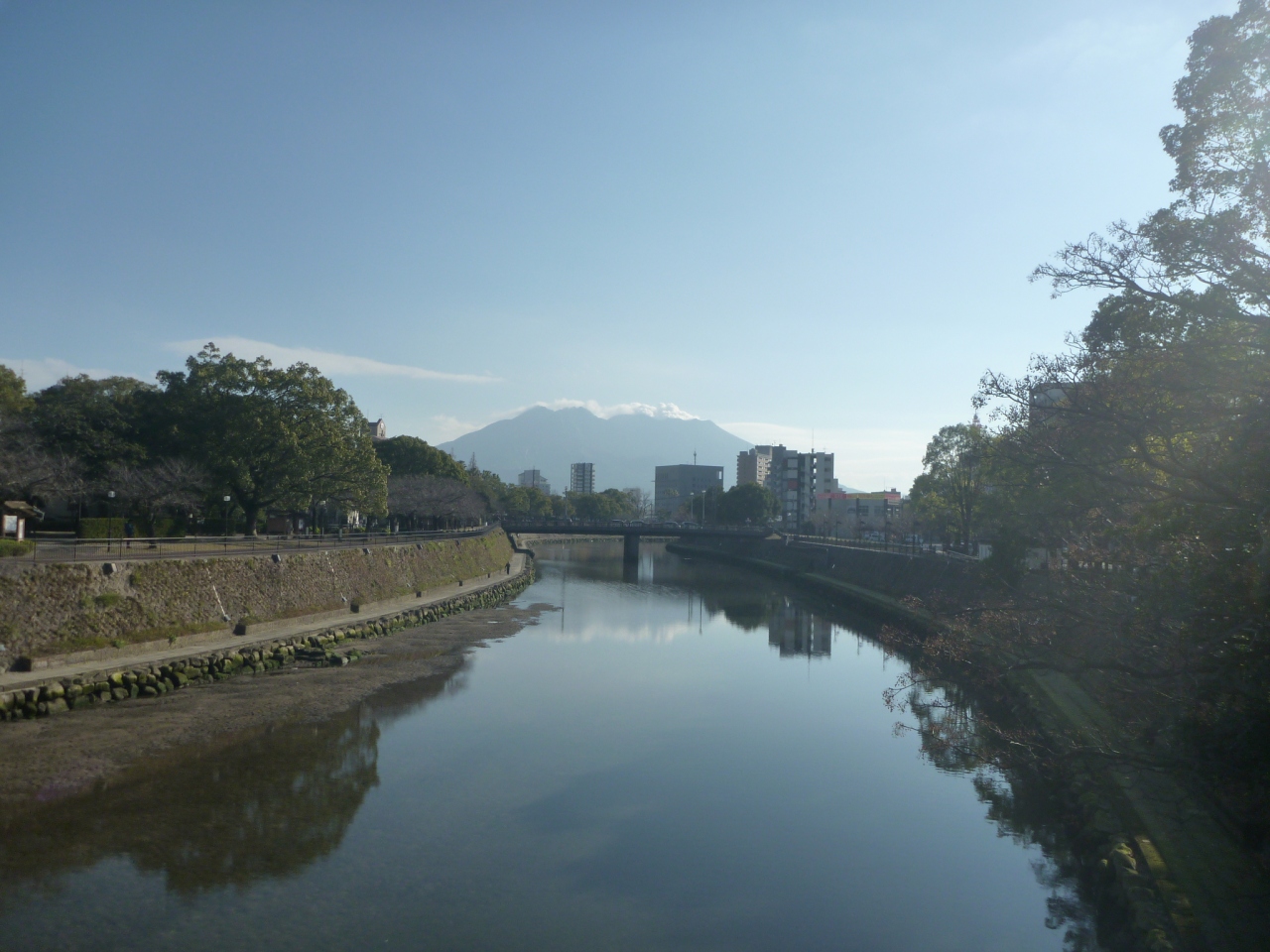 天気が良かったので、甲突川に架かる橋(南洲橋)からは「桜島」の雄姿をしっかりと望むことができました。