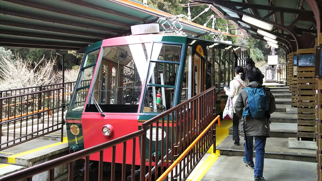 京阪坂本駅から10分ぐらい歩くと着きました。冬は京都側からのアクセスが休止するので、坂本ケーブルの利用が増えます。券売機で往復切符を買いましたが、現金のみでした。日本一長いケーブルカーは乗車時間11分。00分と30分に定時運行していました。途中から急傾斜になりますが、琵琶湖の眺望は良かったです