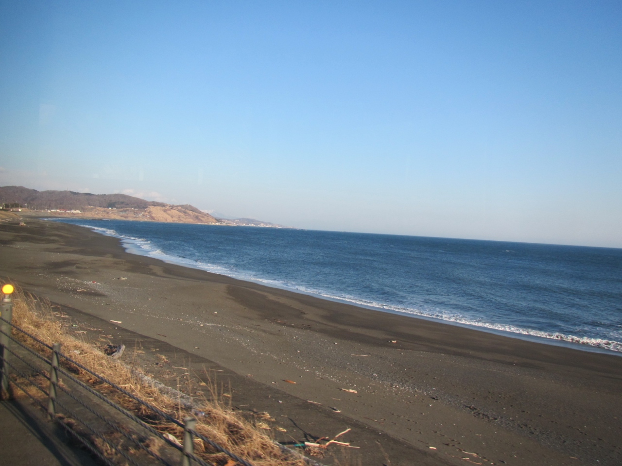 潮の満ち干加減にもよりますが、絵笛川河口周辺、国道235号沿いに10mから20m幅ほどの砂浜が続く海岸です。