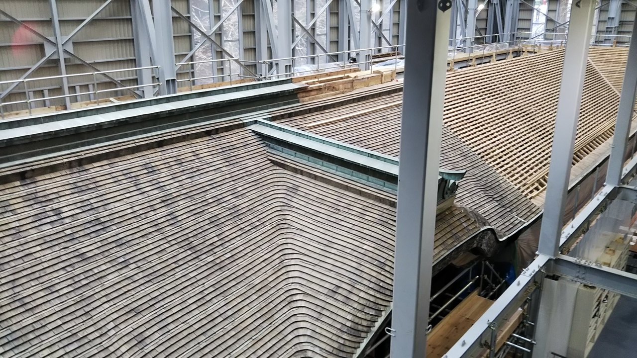 修復中でしたが、根本中堂は中庭部分に足場が組まれ、屋根を修復している様子を見学することができました。靴を脱ぎ、三階建てになっている部分から写真を撮影することができました。職人が屋根に乗り、1枚1枚木材を重ねていました。
