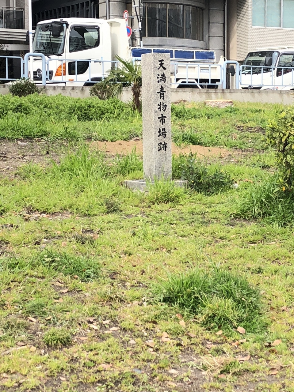 コンラッド大坂に宿泊した日、近所のパティスリーとブーランジェリー巡りで散歩をしてその際に立ち寄りました。今は、公園の中に碑がたっているだけですが、江戸時代から昭和はじめまで、ここに天満青物市場があったようです。