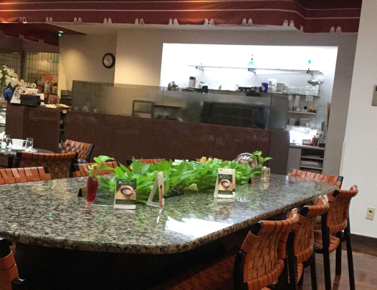 ゆったりした空間に大理石のテーブル、座り心地の良いチェア、壁に掛けられたリトグラフの数々、花と緑。