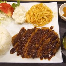 メインプレートに豚カツ、サラダ(グリーンサラダとポテトサラダ)、パスタ、ライスが盛られていて、他に香の物と味噌汁が提供される。