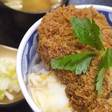 通常のカツ丼は、カツを玉子でとじてあるが、当店のカツ丼は、カツを玉子でとじておらず、玉子を掛けたご飯の上にカツをトッピングしている。これにより、カツは衣がサクサクのまま食べられる。