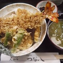 丼にたっぷりのご飯が盛られ、その上に様々な天ぷら(海老、オクラ、インゲン、カボチャ、サツマイモ)を乗せている。